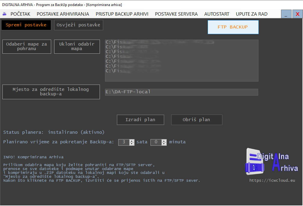 Aplikacija se koristi na način da se vaši podaci koji se sigurnosno spremaju u arhivu pohranjuju na naše servere putem sigurnosnog protokola FTP/SFTP.